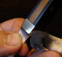 | Daumenleder gelöst | Durch Druck des Daumennagels kann sich das Bogenleder an der Kante lösen. Hier kann mit Kaltleim, der im Geigenbau ansonsten nicht benutzt wird, das Leder wieder angeleimt werden, Ein Faden fixiert den Rand. Für weitere Infos Klicken Sie hier. |