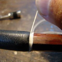 | Silberdraht gelöst | Die Umwickelung der Bogenstange ist meistens aus Silberdraht oder bei einfacheren Bögen aus Neusilber. Sollte sich diese Umspinnung am Ende lösen, kann mit etwas Geschick dieser neu befestigt werden. Für weitere Infos Klicken Sie hier. |